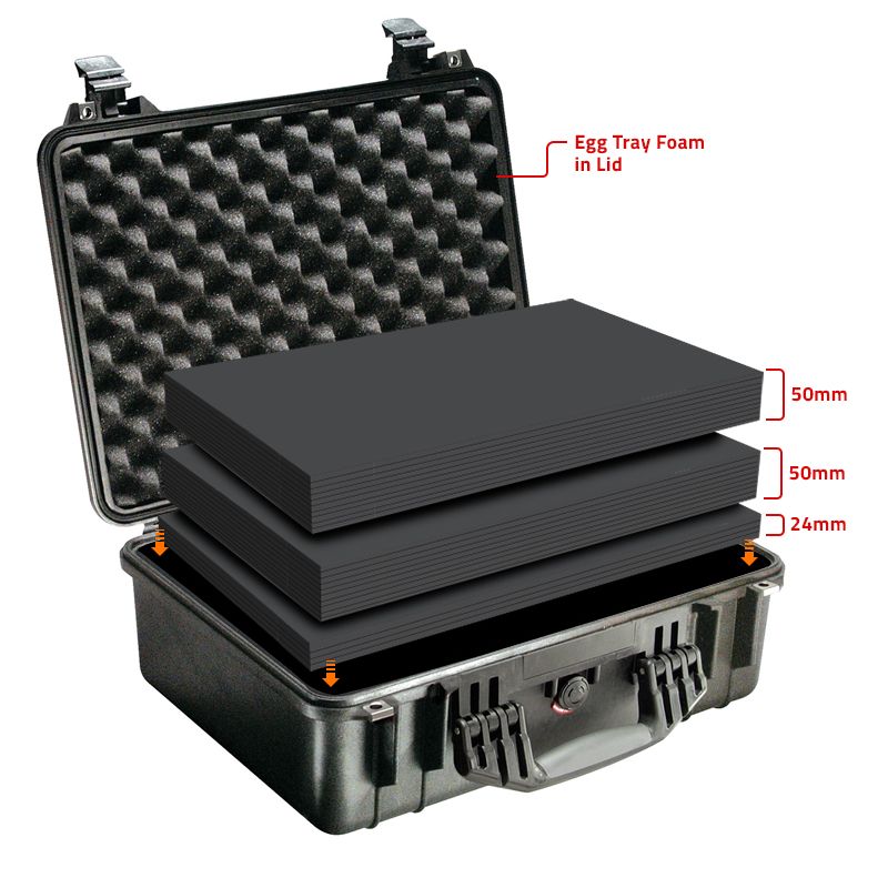 - 2 Lagen Multilayer Schaumstoff 50 mm + 1 Lage Schaumstoff 24 mm + Noppenschaumstoff für den Deckel