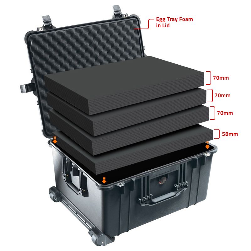 - 3 Lagen Multilayer Schaumstoff 70 mm + 1 Lage Schaumstoff 58 mm + Noppenschaumstoff für den Deckel