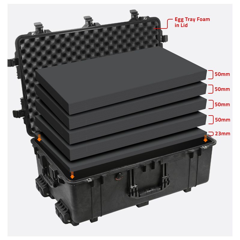 - 4 Lagen Multilayer Schaumstoff 50 mm + 1 Lage Schaumstoff 23 mm + Noppenschaumstoff für den Deckel